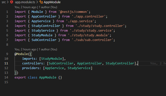그리고 app.module.ts의 controllers의 순서를 SubController가 먼저 오게 바꿔주세요. 이미 AppController에 같은 @Get() 라우팅 경로가 존재하기 때문에 SubController가 먼저 처리될 수 있게 바꿔주셔야 작동합니다. 이렇게 처리해 주면 같은 엔드포인트여도 하위 도메인을 기술함으로써 다르게 처리할 수 있습니다.