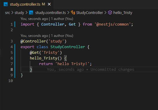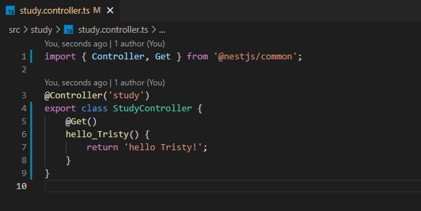 StudyController에 아무것도 없으면 허전하니까 간단하게 @Get() 데코레이터를 사용해서 엔드포인트를 만들어주도록 하겠습니다.