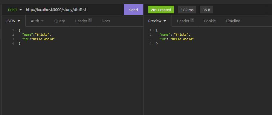 위에서 @Body() 데코레이터를 설명할 때 DTO 객체를 이용해서도 가져올 수 있다고 말씀드렸었는데요. DTO는 데이터가 네트워크를 통해 전송되는 방식을 정의한 객체입니다. 먼저 파일을 하나 생성해서 DTO를 만들어 줍니다. 간단하게 name과 id만을 받는 DTO를 만들어보았습니다. 클라이언트에서 해당 서버로 데이터를 전송할 때 DTO 규칙을 지키지 않으면 에러가 나기 때문에 반드시 형식을 지켜서 Body에 담아야 합니다.