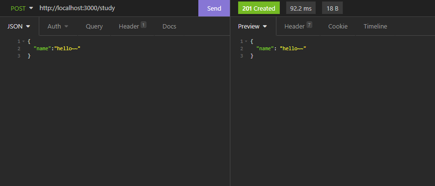 Nest에서 응답 상태 코드는 201을 사용하는 Post를 제외하고는 항상 기본적으로 200으로 설정됩니다. 방금은 메소드에 응답 코드 변경을 위한 설정을 해주지 않았기 때문에, 디폴트로 200 응답 코드가 반환되었습니다. 만약 바꾸고 싶다면 @HttpCode() 데코레이터를 추가해 상태 코드를 바꿀 수 있습니다. 201로 바꾸고 insomnia를 확인해보면 잘 변경된 것을 확인할 수 있습니다. 다만, HTTP 응답 코드들은 저마다 뜻이 존재하기 때문에 변경할 때는 신중하게 변경하는 것이 좋습니다. 201 응답 코드의 경우에는 요청이 성공적으로 처리되었고, 새로운 자원이 만들어진 경우에 사용하는 응답 코드인데, 바꾼 코드에서는 새로운 자원을 만드는 행위가 없었기 때문에 원래라면 사용하면 안 되는 코드입니다. 예제는 예제일 뿐!