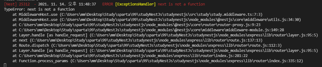 여기서 주의 사항이 있는데요. 미들웨어를 만들다가 "StudyMiddleware에 req, res는 사용하지 않는데 제거해도 괜찮지 않을까?"라는 생각을 하실 수도 있습니다. 그래서 한번 없애보고 실행을 해보도록 하겠습니다.